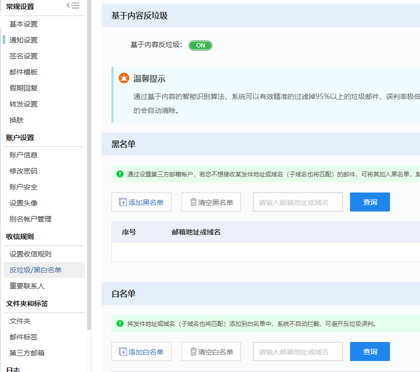 功能路径:邮箱设置 – 收信规则 – 反垃圾/黑白名单 – 基于内容反垃圾操作
