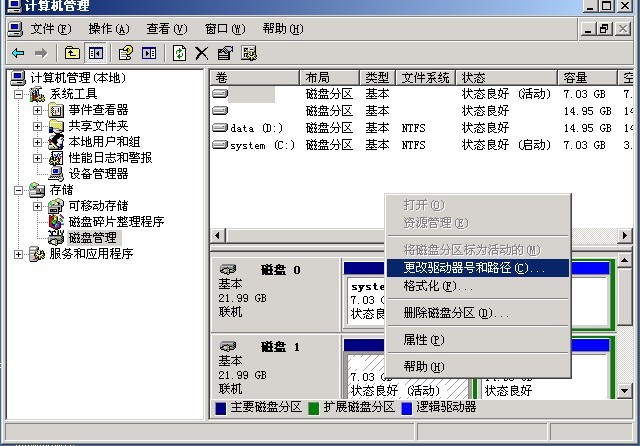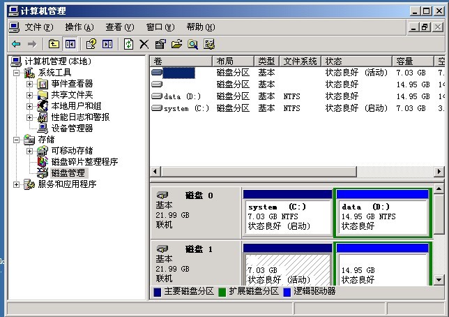 vps服务器重装后,再次远程连接上去,发现我的电脑只有C盘D盘,其他盘都不见了,而且,C盘D盘没有原来的数据文件了。这时候,按照下面操作就可以找回原来的数据和磁盘分区: 1.远程连接服务器,在桌面我的电脑上点击右键--管理。然后选中磁盘管理,如下: